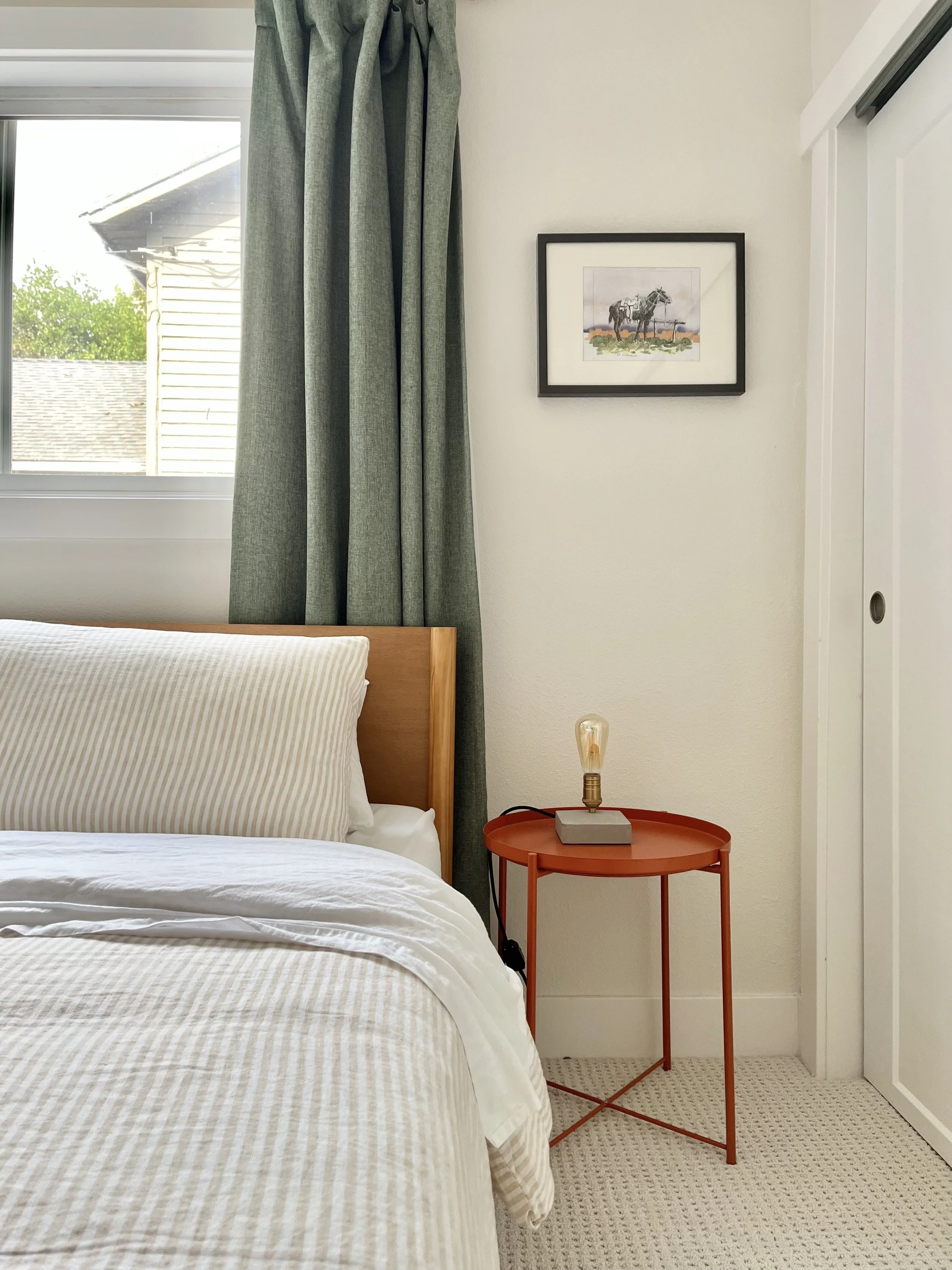 soft creamy white walls provide the perfect backdrop for green linen draperies, an orange metal nightstand, and a teak bedframe with white and tan striped bedding