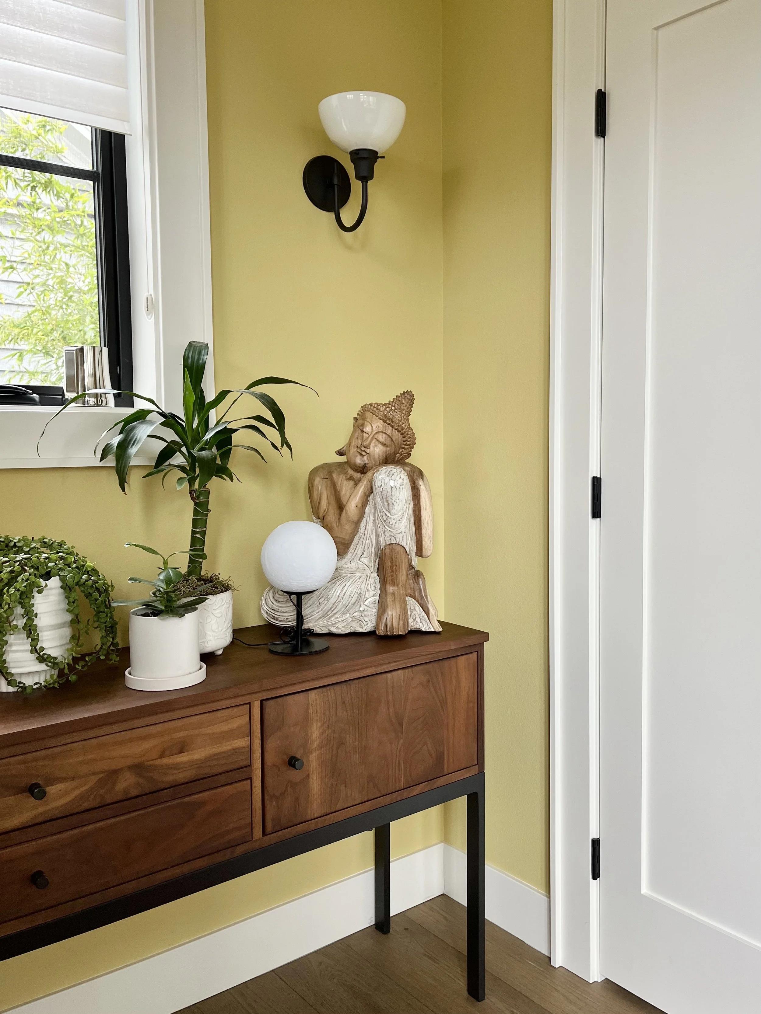 cheerful chartreuse entryway walls and white trim with plants and a buddah statue on top of a walnut console table