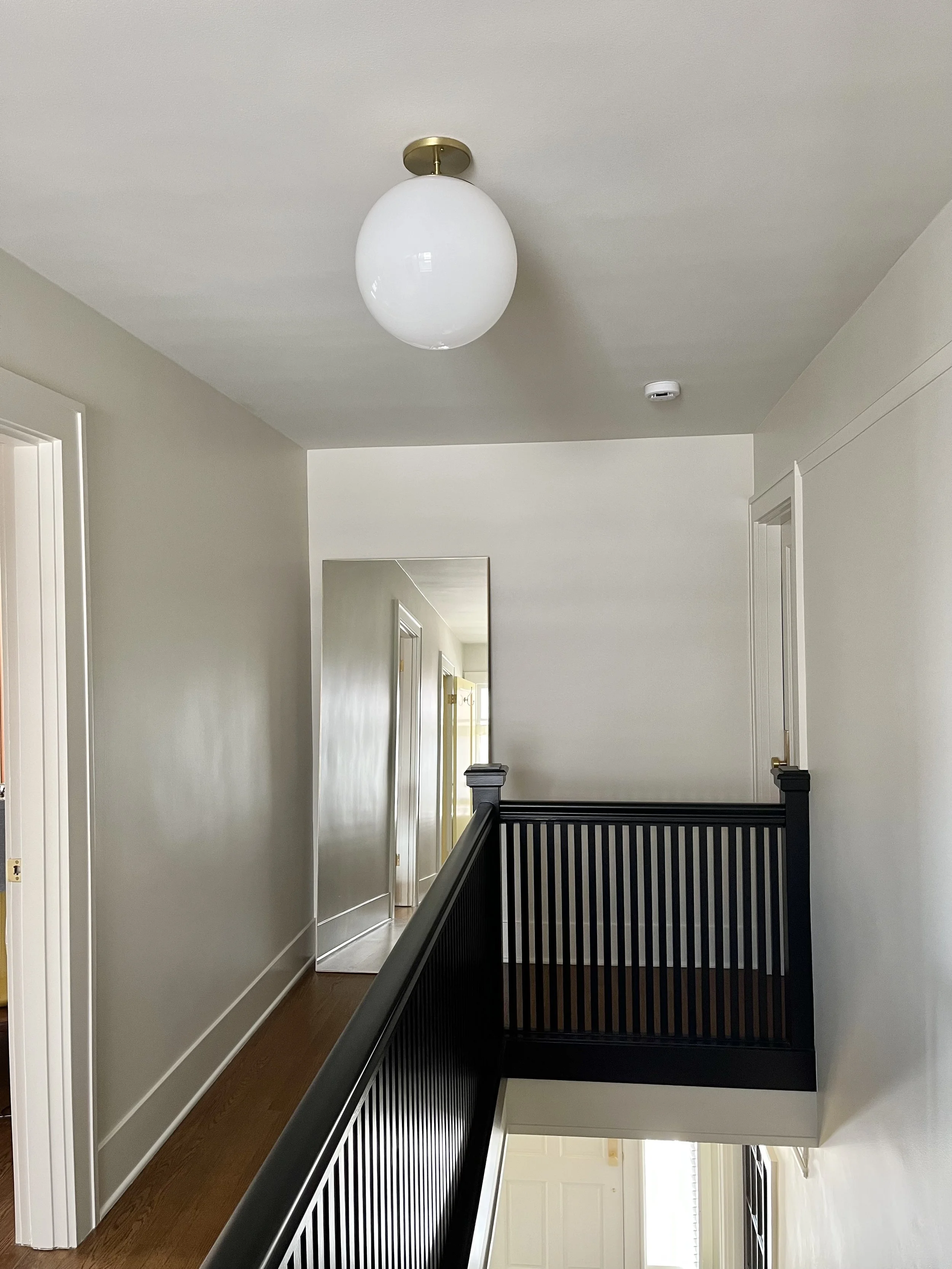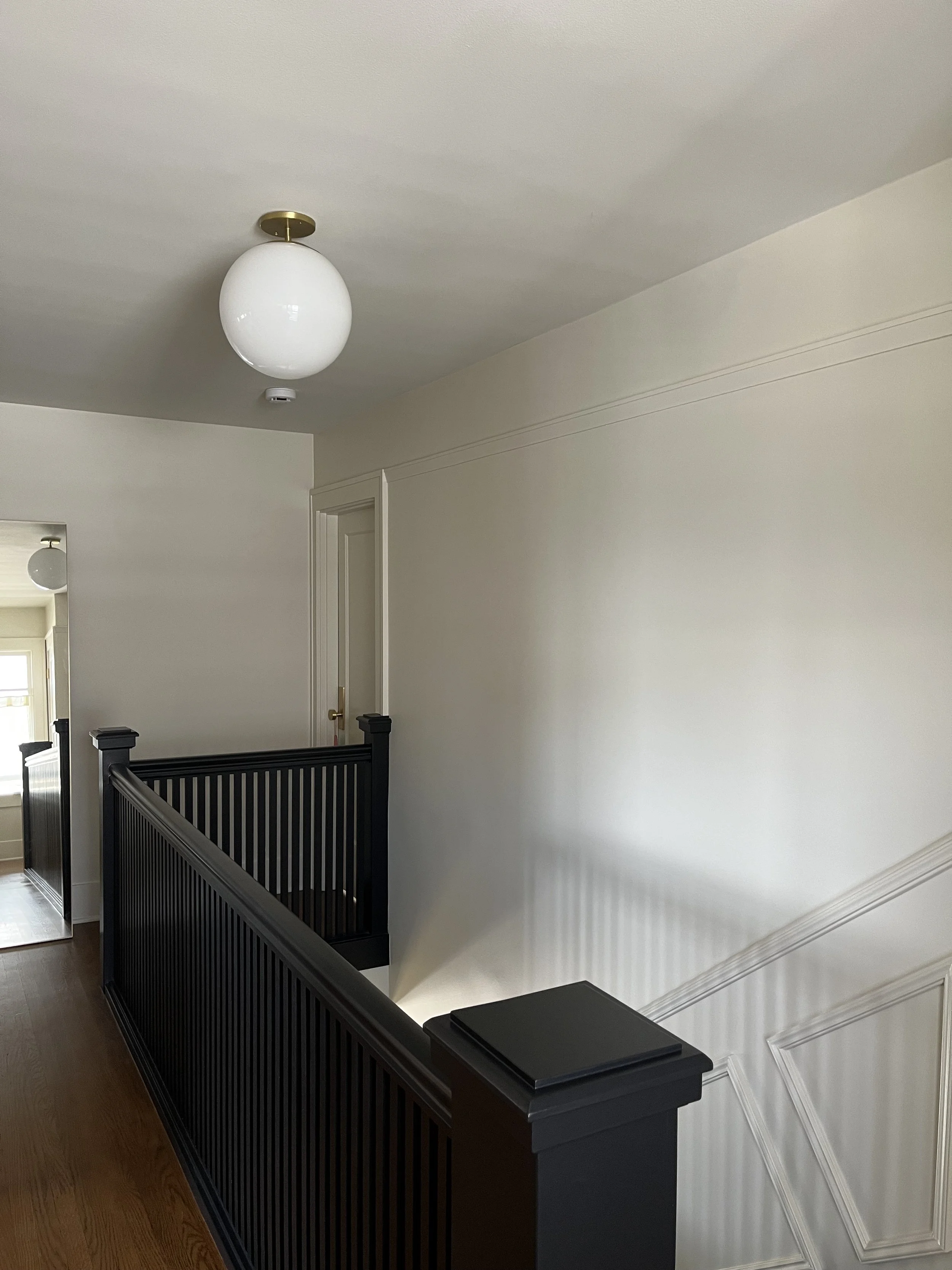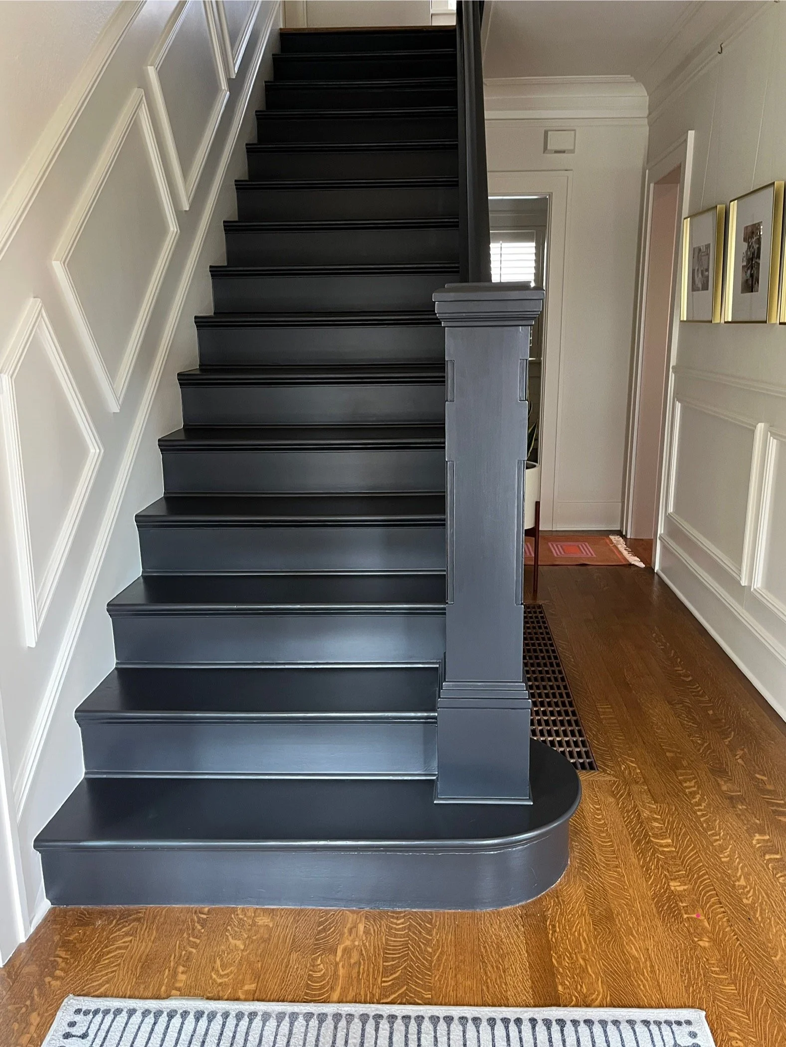 To keep things neutral but impactful (it is an entryway after all and first impressions matter!), our clients opted for high contrast between their entry colors to accentuate the visual texture from the trim going along the stairwell walls. Choosing an off-white that didn’t feel too cold, and a bold glossy black for the stairs, acted as the perfect visual palette cleanser before each adjoining room charms them with their unique color and whimsy!