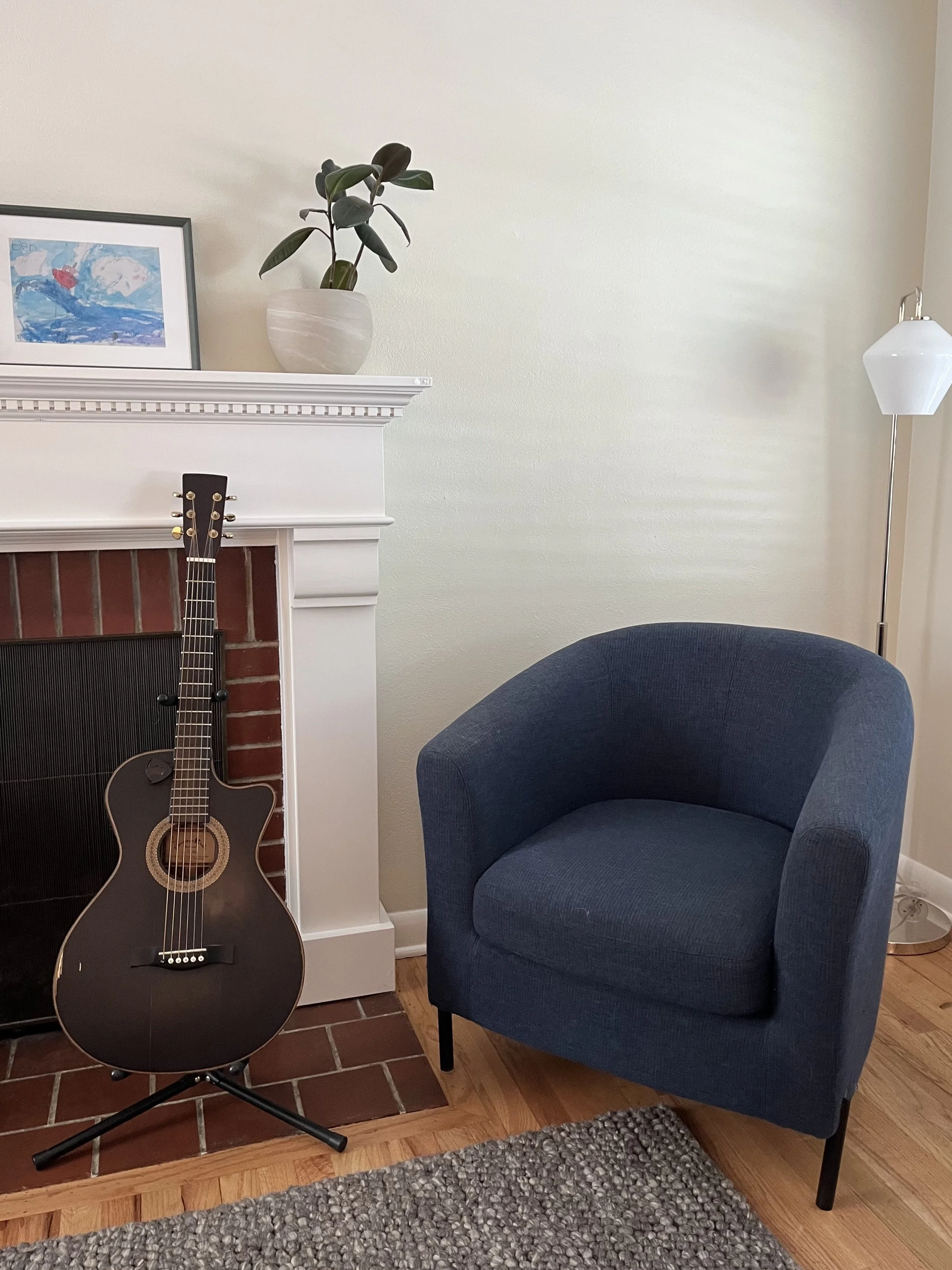 Ready to move in to their newly remodeled home, our clients vision for their living room and dining room were pretty simple: soft and warm. They were working around brick accents on their fireplace and warm honey-toned kitchen cabinetry that had to stay, so they didn’t want the walls to compete with those. Planning to go a bit bolder in the kitchen, they planned to cross-pollinate the terracotta tones from the bricks to make their cabinets pop with a color the space already supported.