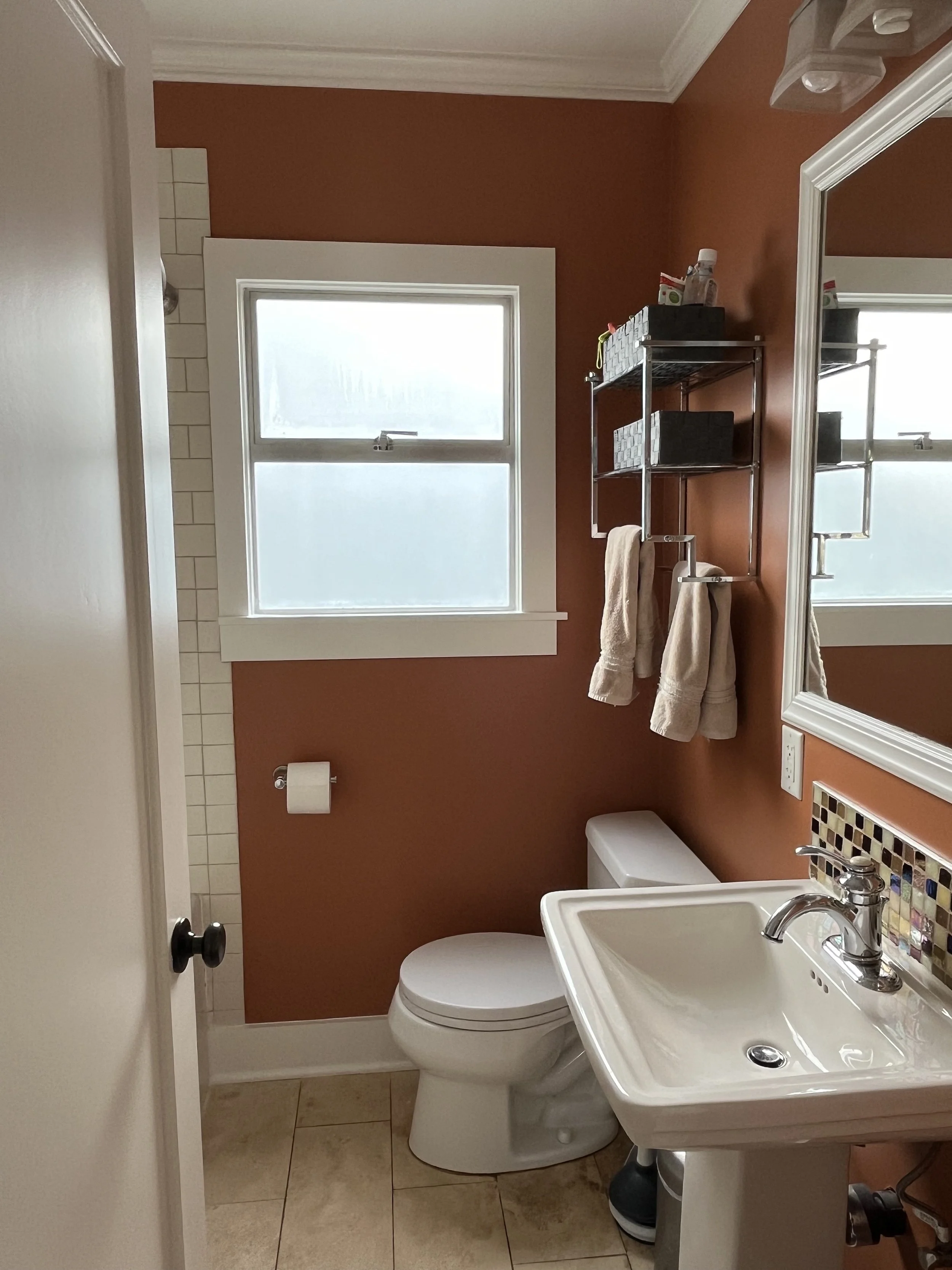 Not keen on the expected, our clients wanted to get the most bang for their buck in this bathroom without having to replace any of the tiles or other fixtures. Working with, rather than against, the multi-colored sink backsplash tile the previous owners had chosen, we found a color that complimented without competing. The result was a stunning and playful mid-toned orange with just enough of a muted undertone to keep it from feeling overwhelmingly bright.